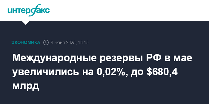 Москва. 6 июня. INTERFAX.RU - Объем международных (золотовалютных) резервов РФ в мае 2025 года увеличился на $108 млн, или на 0,02%, до $680,379 млрд с $680,271 млрд, согласно информации на сайте ЦБ РФ.