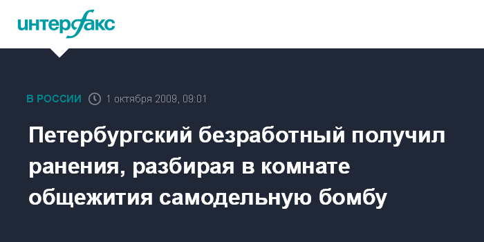 Москва. 1 октября. INTERFAX.RU - В Санкт-Петербурге в общежитии "Ленинградского металлического завода" произошел взрыв, эквивалентный по мощности 30 граммам тротила, в результате ранения получил проживающий там безработный житель северной столицы. "В среду в общежитии произошел взрыв, равный по мощности 30 граммам тротила. Причиной взрыва стало неосторожное обращение с неизвестным взрывным устройством, предположительно, самодельным, безработного гражданина, который проживал в этом общежитии", - сообщил "Интерфаксу" источник в правоохранительных органах. По его словам, безработный получил осколочные ранения, а также лишился пальцев рук. По данному факту возбуждено уголовное дело по статье 222 УК РФ.