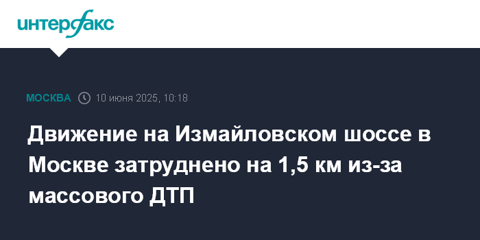 "На Измайловском шоссе в районе дома 71 произошло ДТП с участием шести автомобилей. (...) Движение в районе ДТП затруднено на 1,5 км. Пожалуйста, выбирайте пути объезда", - говорится в сообщении, опубликованном в телеграм-канале дептранса во вторник.