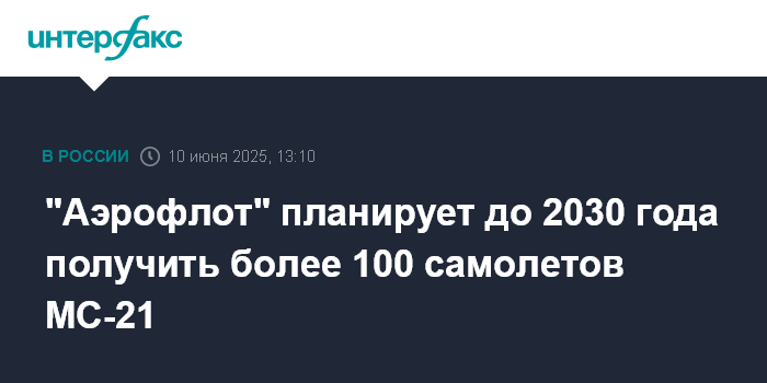 Москва. 10 июня. INTERFAX.RU - Группа "Аэрофлот" планирует до 2030 года получить более 100 самолетов МС-21, сообщил гендиректор компании Сергей Александровский "России-24".