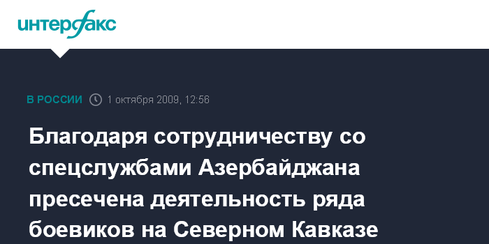 Москва. 1 октября. INTERFAX.RU - Федеральная служба безопасности России отмечает эффективность взаимодействия со спецслужбами Азербайджана в противодействии террористическим угрозам в Кавказском регионе. "Благодаря обмену информацией и совместным оперативным мероприятиям с нашими азербайджанскими коллегами удалось предотвратить переброску на территорию Чеченской Республики многих боевиков и иностранных наемников", - заявил в четверг "Интерфаксу" представитель ФСБ России. По его словам, из Министерства национальной безопасности (МНБ) Азербайджана в ФСБ России на регулярной основе поступает информация о планах проникновения на территорию России установленных боевиков для участия в незаконных вооруженных формированиях на Северном Кавказе.