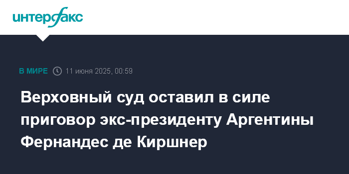 Москва. 11 июня. INTERFAX.RU - Верховный суд Аргентины принял решение оставить в силе приговор, вынесенный бывшему президенту страны Кристине Фернандес де Киршнер, сообщает агентство ЭФЭ. Ее признали виновной по делу о коррупции и назначили шесть лет тюремного заключения.