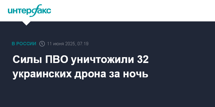 "В период с 20:00 по Москве 10 июня до 07:00 по Москве 11 июня дежурными средствами ПВО перехвачены и уничтожены 32 украинских беспилотных летательных аппарата самолетного типа", - говорится в сообщении.