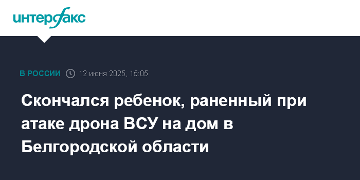 Москва. 12 июня. INTERFAX.RU - Скончался двухлетний ребенок, получивший травмы при атаке украинского беспилотника на жилой многоквартирный дом в поселке Борисовка Борисовского района Белгородской области, сообщил глава региона Вячеслав Гладков.