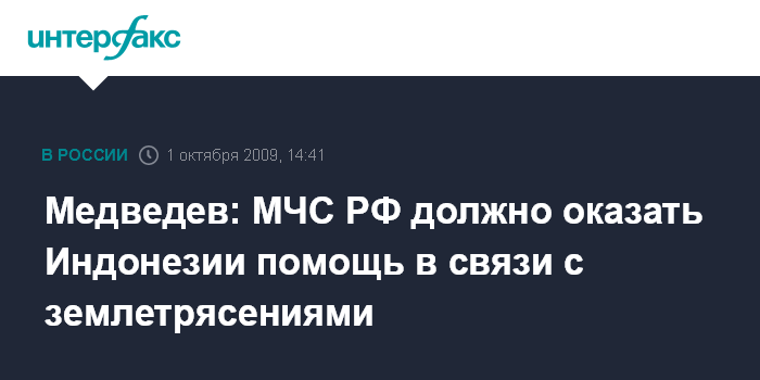 Москва. 1 октября. INTERFAX.RU - Президент РФ Дмитрий Медведев поручил главе МЧС Сергею Шойгу оказать всю необходимую помощь Индонезии в ликвидации последствий серии землетрясений, произошедших в этой стране, сообщила пресс-секретарь главы российского государства Наталья Тимакова.