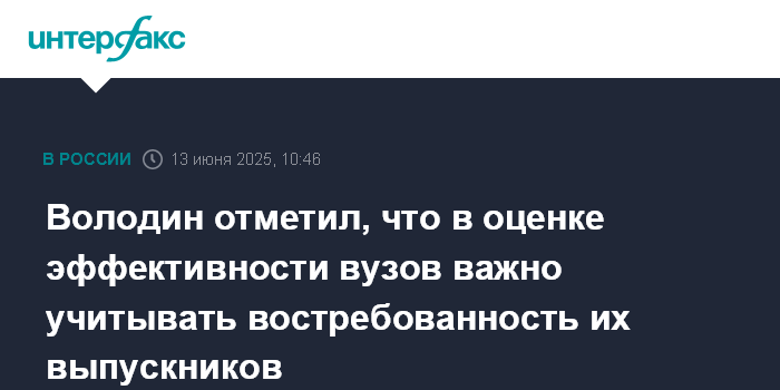 Москва. 13 июня. INTERFAX.RU - Председатель Госдумы Вячеслав Володин считает правильным оценивать эффективность вузов с учетом трудоустроенности их выпускников по специальности.