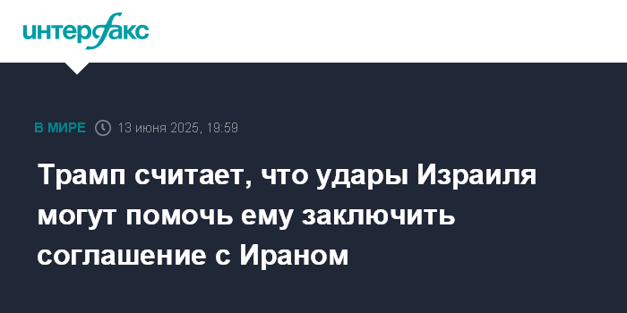 Москва. 13 июня. INTERFAX.RU - Президент США Дональд Трамп заявил, что серия атак Израиля по Ирану может поспособствовать заключению соглашения между Вашингтоном и Тегераном по иранской ядерной программе, сообщает портал Axios.