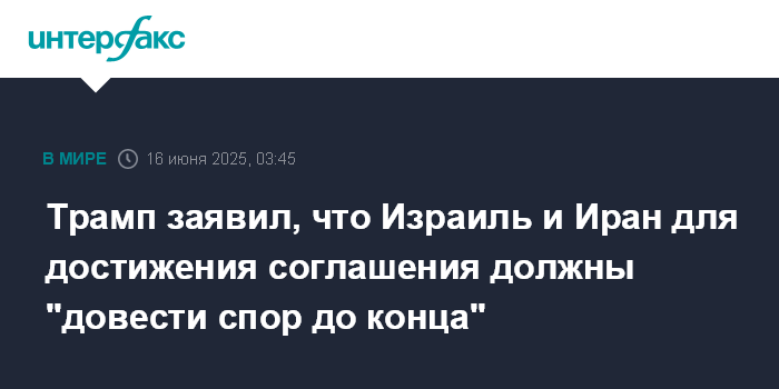 Москва. 16 июня. INTERFAX.RU - Президент США Дональд Трамп считает, что для достижения соглашения об урегулировании конфликта между Израилем и Ираном странам надо дать "довести спор до конца".