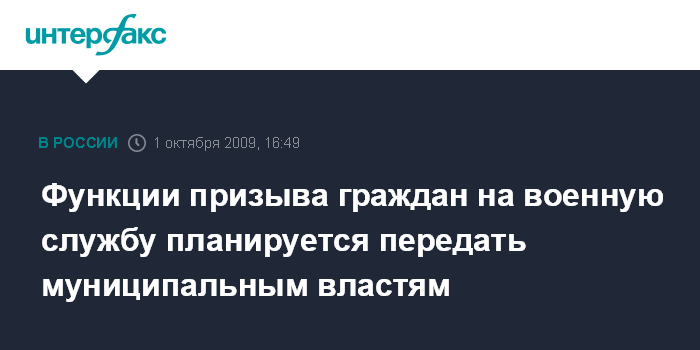 Москва. 1 октября. INTERFAX.RU - Минобороны планирует передать функции призыва граждан на военную службу муниципальным властям, заявил замначальника главного штаба сухопутных войск, генерал-лейтенант Сергей Антонов. "Министерство обороны будет делать оборонный заказ муниципальным органам власти на подготовку и призыв граждан для службы в армии и на флоте", - сказал С.Антонов в четверг в ходе "круглого стола", посвященного осеннему призыву. Он уточнил, что в настоящее время разрабатывается проект предложения, связанный с передачей функций призыва граждан на военную службу от военного ведомства местным органам власти.
