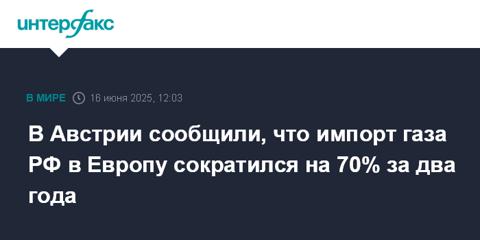 Москва. 16 июня. INTERFAX.RU - Импорт российского газа в страны Европы удалось сократить почти на 70% за два года, но зависимость от него всё ещё сохраняется, заявила в понедельник госсекретарь министерства экономики, энергетики и туризма Австрии Элизабет Цехетнер.