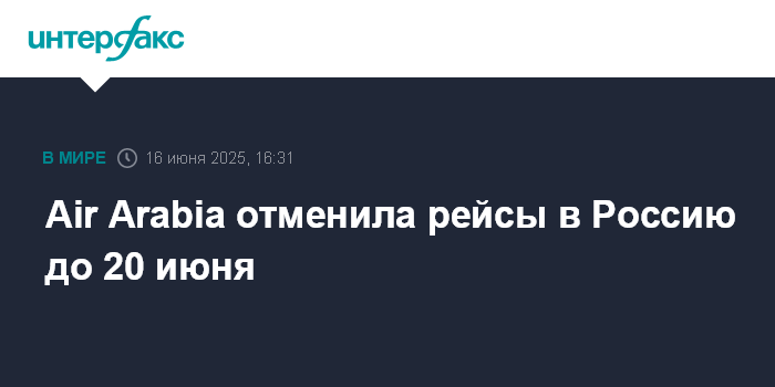 Москва. 16 июня. INTERFAX.RU - Авиакомпания Air Arabia на фоне обострения ситуации на Ближнем Востоке отменила все рейсы в Россию до 20 июня включительно, сообщается на сайте компании.