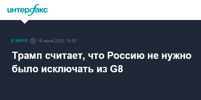 Москва. 16 июня. INTERFAX.RU - Президент США Дональд Трамп в понедельник заявил, что считает ошибкой исключение России из состава "Группы восьми".