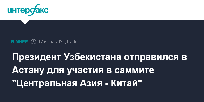 Москва. 17 июня. INTERFAX.RU - Президент Узбекистана Шавкат Мирзиёев отбыл в столицу Казахстана во вторник для участия в саммите "Центральная Азия - Китай", сообщила пресс-служба узбекского лидера.