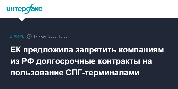 Москва. 17 июня. INTERFAX.RU - Еврокомиссия предложила запретить с 2026 года заключение долгосрочных контрактов на пользование европейскими терминалами по приему, хранению и перевалке сжиженного природного газа для компаний из России или контролируемых ими юрлиц, говорится в пресс-релизе ЕК.