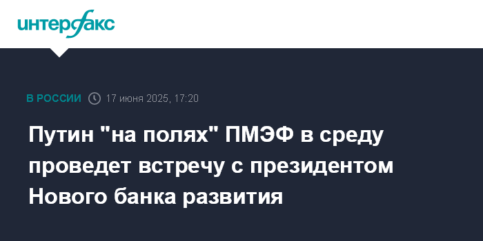 Путин "на полях" ПМЭФ в среду проведет встречу с президентом Нового банка развития