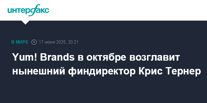 Москва. 17 июня. INTERFAX.RU - Новым главным исполнительным директором Yum! Brands Inc. с 1 октября станет Крис Тернер, который в настоящее время является главным финансовым директором, говорится в сообщении американской компании.