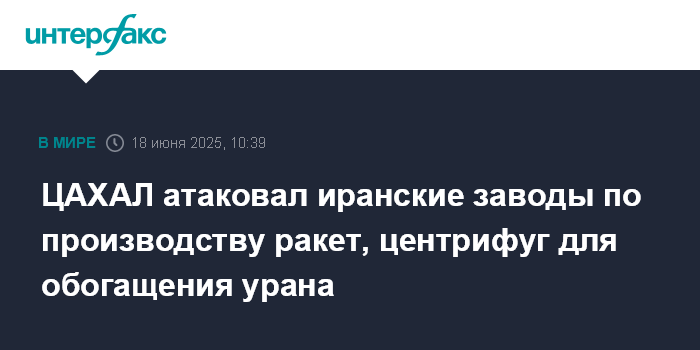 Москва. 18 июня. INTERFAX.RU - Израильские ВВС в ходе масштабной ночной операции нанесли удары в районе Тегерана по заводам по производству баллистических ракет, систем ПВО и центрифуг по обогащению урана, передает в среду The Jerusalem Post.