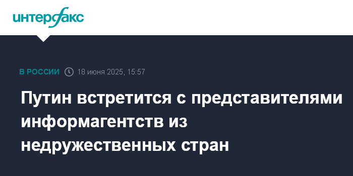 Москва. 18 июня. INTERFAX.RU - Представители международных информационных агентств из недружественных стран примут участие во встрече с президентом РФ Владимиром Путиным на Петербургском международном экономическом форуме (ПМЭФ), заявил пресс-секретарь главы государства Дмитрий Песков.