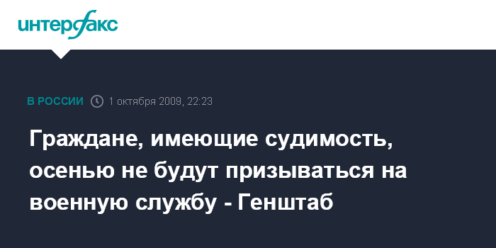 Москва. 1 октября. ИНТЕРФАКС - В ходе осеннего призыва 2009 года, который начался 1 октября, на военную службу не будут призываться граждане, имеющие снятую или погашенную судимость, сообщил "Интерфаксу-АВН" начальник Главного организационно-мобилизационного управления Генштаба Василий Смирнов.