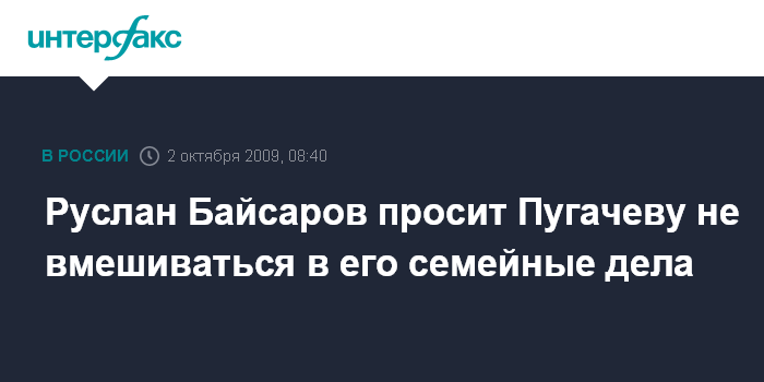 Махачкала. 2 октября. INTERFAX.RU - Предприниматель Руслан Байсаров уверен, что он и его бывшая жена Кристина Орбакайте сумеют найти разумный выход из конфликтной ситуации, возникшей в связи с правами на их сына Дени, и просит мать Кристины - певицу Аллу Пугачеву отказаться от вмешательства в дела его семьи.