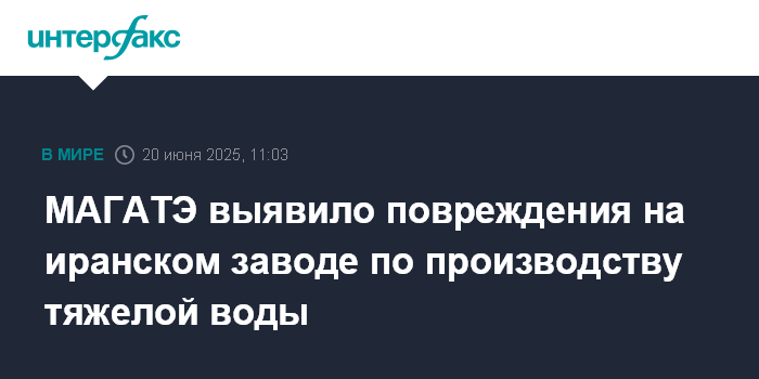 Москва. 20 июня. INTERFAX.RU - МАГАТЭ зафиксировало повреждения на иранском заводе по производству тяжелой воды в Араке, сообщает в пятницу МАГАТЭ в соцсети X.