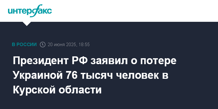 Москва. 20 июня. INTERFAX.RU - Вооруженные силы Украины потеряли 76 тыс. человек в ходе боевых действий в Курской области, заявил президент РФ Владимир Путин.