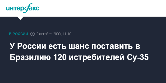 Москва. 2 октября. INTERFAX.RU - Российский истребитель Су-35 имеет все шансы победить в проводимом Бразилией тендере F-X2 на закупку и лицензионную сборку 120 многофункциональных боевых самолетов, считают в Рособоронэкспорте. "Разумеется, нам бы хотелось победить в этом тендере. Поэтому Бразилии и был предложен истребитель Су-35 - новый российский боевой суперсамолет. Я уверен, что наше предложение в наибольшей степени отвечает потребностям Бразилии", - сказал генеральный директор ФГУП "Рособоронэкспорт" Анатолий Исайкин "Интерфаксу-АВН" в пятницу. Он сообщил, что тендер предполагает на первом этапе до 2015 года закупку Бразилией 36 многофункциональных боевых самолетов, на втором этапе, в период до 2024 года - совместную сборку в Бразилии еще 84 машин. "Таким образом, общее количество самолетов составит 120 единиц", - сказал Исайкин.