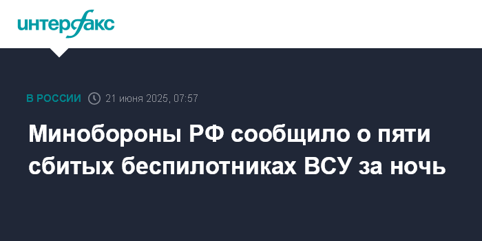 Москва. 21 июня. INTERFAX.RU - В ночь на субботу российские военные уничтожили пять украинских беспилотников над тремя регионами России, сообщили в министерстве обороны РФ.
