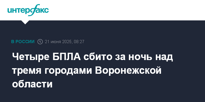 Москва. 21 июня. INTERFAX.RU - Губернатор Воронежской области Александр Гусев сообщил об уничтожении в ночь на субботу четырех беспилотников над тремя городами региона.