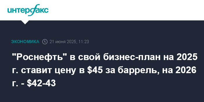 "Роснефть" в свой бизнес-план на 2025 г. ставит цену в $45 за баррель, на 2026 г. - $42-43