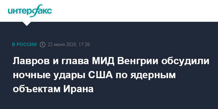 Москва. 22 июня. INTERFAX.RU - Главы МИД РФ и Венгрии Сергей Лавров и Петер Сийярто в ходе телефонного разговора обсудили ситуацию в связи с ударами США по ядерным объектам Ирана, сообщает в воскресенье российское внешнеполитическое ведомство.