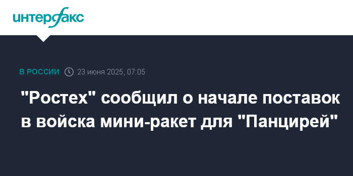 Москва. 23 июня. INTERFAX.RU - Холдинг "Высокоточные комплексы" (входит в "Ростех") начал поставки российским военным новых зенитных управляемых ракет ближнего перехвата для комплексов "Панцирь", сообщили в "Ростехе" в понедельник.