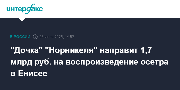 "Дочка" "Норникеля" направит 1,7 млрд руб. на воспроизведение осетра в Енисее
