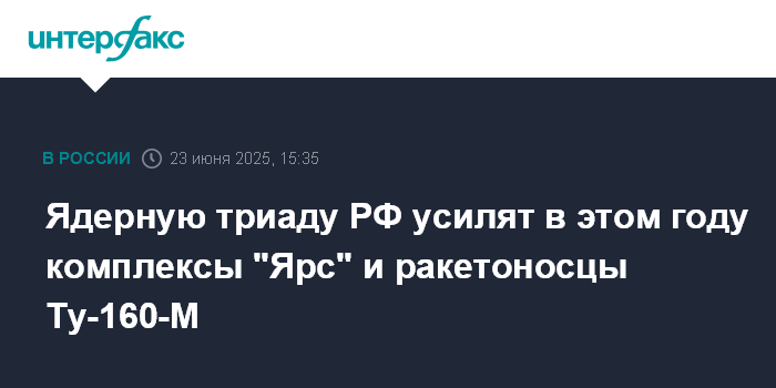 Москва. 23 июня. INTERFAX.RU - Комплексы "Ярс" и ракетоносцы Ту-160-М пополнят в этом году стратегические ядерные силы страны, заявил президент РФ Владимир Путин в понедельник.