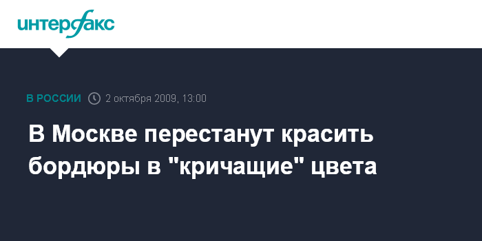 Москва. 2 октября. INTERFAX.RU - Столичные власти приняли решение отказаться от систематической покраски дорожных бордюров в "кричащие" цвета. "Мы уже написали письма в префектуры округов, чтобы они перестали красить бордюры в желто-зеленые или прочие кричащие, не сочетающиеся цвета", - рассказал И.Воскресенский на пресс-конференции в центральном офисе "Интерфакса" в пятницу. Он посетовал, что "традиции", сложившиеся годами, трудно изжить. "Но со временем это уйдет, так как мы хотели бы видеть наш город в совершенно другом виде и качестве", - обещал Воскресенский.