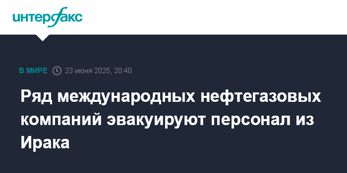 Москва. 23 июня. INTERFAX.RU - Некоторые международные нефтегазовые компании эвакуируют работников с месторождений в Ираке в связи с эскалацией военной напряженности на Ближнем Востоке, сообщило Iraq News Agency со ссылкой на государственную Basra Oil Company (BOC).