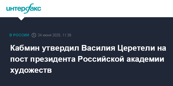 Москва. 24 июня. INTERFAX.RU - Правительство РФ утвердило на пост президента Российской академии художеств (РАХ) кандидатуру Василия Церетели, избранного академиками на эту должность на общем собрании РАХ, сообщает пресс-служба кабинета министров.