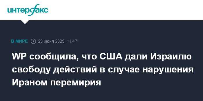 Москва. 25 июня. INTERFAX.RU - Администрация президента США Дональда Трампа дала израильским властям понять, что у Израиля будет возможность ответить так, как он посчитает нужным, если Иран нарушит перемирие, сообщает в среду The Washington Post со ссылкой на источники.
