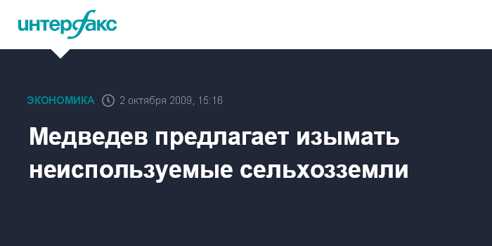 Малоархангельск (Орловская область). 2 октября. INTERFAX.RU - Президент РФ Дмитрий Медведев поручил в месячный срок разработать законопроект, который позволит изымать неиспользуемые в течение трех лет земли сельхозназначения или существенно повышать налоги на них.