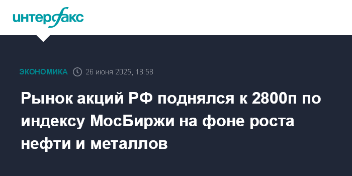 Москва. 26 июня. INTERFAX.RU - Рынок акций РФ в четверг вырос на улучшении сырьевой конъюнктуры (подорожали нефть и металлы) благодаря ослаблению доллара на Forex, а также на надеждах на смягчение монетарной политики ЦБ РФ в июле в условиях замедления инфляции; сдерживающими факторами для покупателей остаются риски новых антироссийских санкций Запада и нерешенность вопроса о мирном урегулировании конфликта на Украине. Индекс МосБиржи в течение дня протестировал рубеж 2800 пунктов, но удержать его не смог; лидировали в росте бумаги металлургов во главе с акциями ОК "Русал" (+3%), "Норникеля" (+2,9%) и "Эн+ груп" (+2,8%).