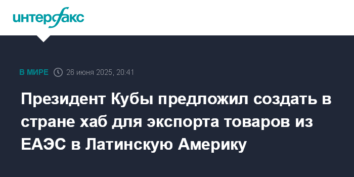 Москва. 26 июня. INTERFAX.RU - Президент Кубы Мигель Марио Диас-Канель Бермудес в своем выступлении на Евразийском экономическом форуме в Минске предложил создать хаб для транзита продукции ЕАЭС в Латинскую Америку.