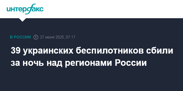 Москва. 27 июня. INTERFAX.RU - Средства ПВО уничтожили 39 украинских беспилотников в течение прошедшей ночи, сообщили в Минобороны РФ.