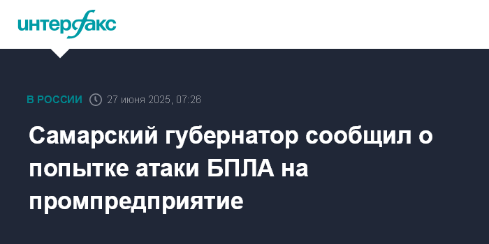 Москва. 27 июня. INTERFAX.RU - Губернатор Самарской области Вячеслав Федорищев сообщил о попытке атаки БПЛА на промышленное предприятие в Новокуйбышевске, никто не пострадал.