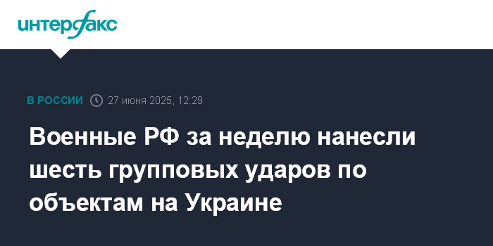 Москва. 27 июня. INTERFAX.RU - Вооруженные силы России за неделю нанесли шесть групповых ударов высокоточным оружием и беспилотниками по военной инфраструктуре Украины, сообщает министерство обороны РФ.