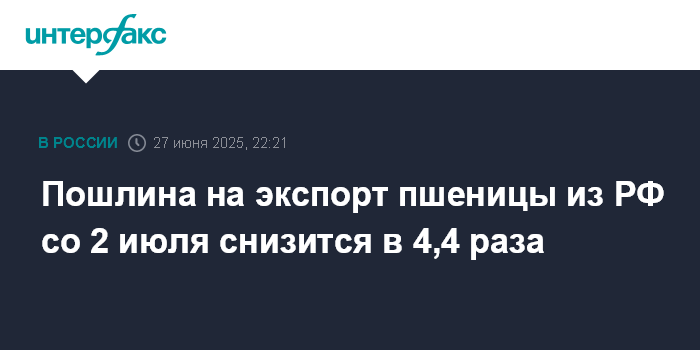 Пошлина на экспорт пшеницы из РФ со 2 июля снизится в 4,4 раза