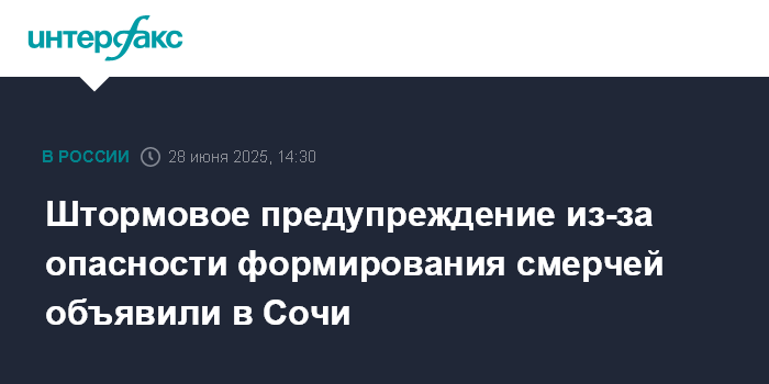Москва. 28 июня. INTERFAX.RU - Формирование смерчей над морем прогнозируется на участке Магри - Веселое в Сочи с 29 по 30 июня, сообщает пресс-служба ГУ МЧС России по Краснодарскому краю.