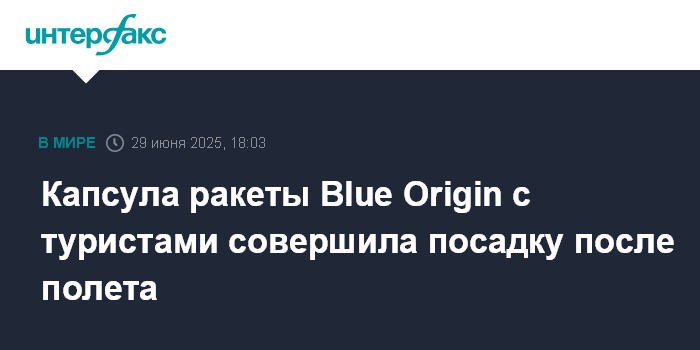 Москва. 29 июня. INTERFAX.RU - Спускаемая капсула американской многоразовой ракеты New Shepard в воскресенье после суборбитального коммерческого полета с экипажем в составе шести туристов успешно приземлилась на западе штата Техас, сообщила компания-разработчик Blue Origin.