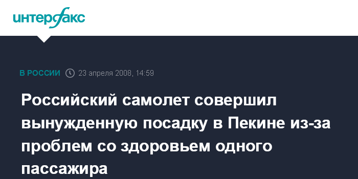 Новосибирск. 23 апреля. INTERFAX.RU - Самолет А-310 авиакомпании "Сибирь", следовавший по маршруту Новосибирск - Санья (курорт в КНР) совершил вынужденную посадку в Пекине из-за того, что один из пассажиров почувствовал сильное недомогание.