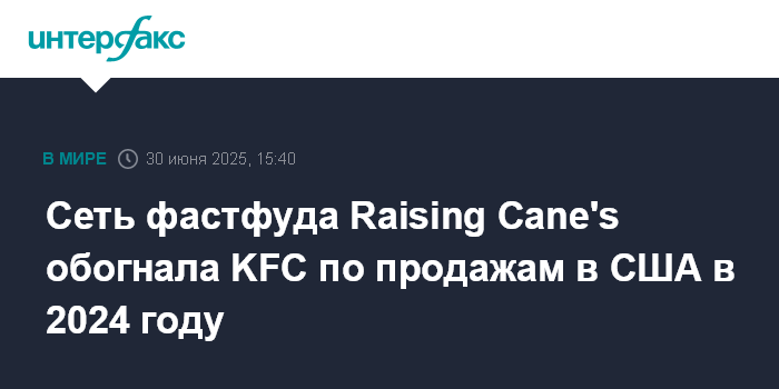 Сеть фастфуда Raising Cane's обогнала KFC по продажам в США в 2024 году