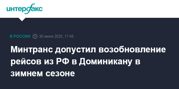 Москва. 30 июня. INTERFAX.RU - Авиасообщение с Доминиканской Республикой может возобновиться в предстоящем зимнем сезоне "при достижении необходимых договоренностей", сообщили в Минтрансе РФ.